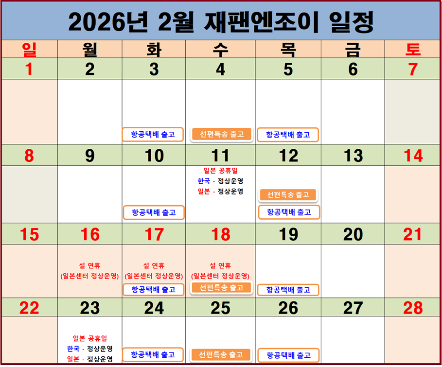 *2026년 2월 16,17,18일(월, 화 ,수) - 설 연휴 한국 휴무 / 일본센터 정상근무 (* 휴무 일정 및 선편특송편 및 항공택배편 특송 배송일정은 현지 사정에 따라 유동적으로 변경될 수 있습니다)