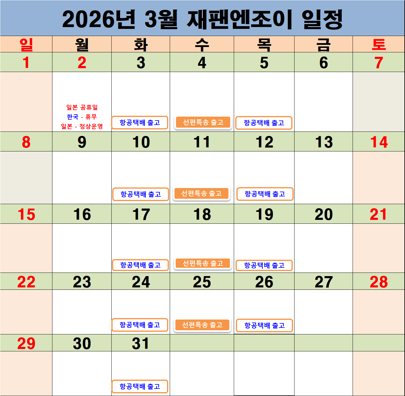 *항공택배편의 경우 3월 한달간 매주 화, 목요일 출고가 예정되어 있습니다 *선편특송편의 경우 3월 한달간 매주 수요일 출고가 예정되어 있습니다