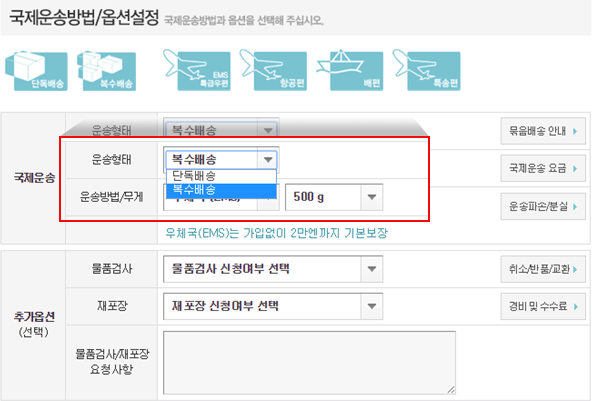 복수배송 : 2,400엔 (1.5Kg EMS 운임) X 1개 +350엔 (복수설정비70엔X5개) = 2,750엔 300g 물품 5개를 복수배송으로 보낼 경우 1,750엔 절감